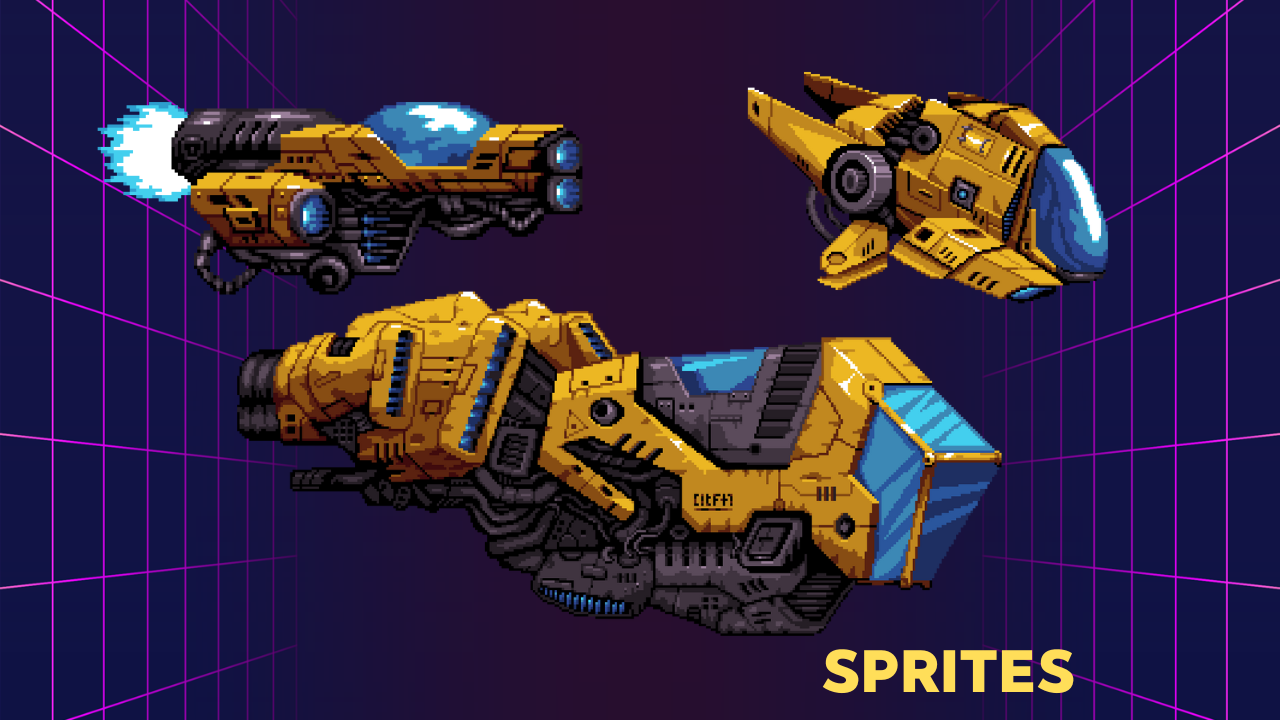 The pack contains 3 different sprites with a thrust animation for each vehicle. All sprites are in png files and an aseprite file in case you want to edit it. Also I included the music track included in the video.